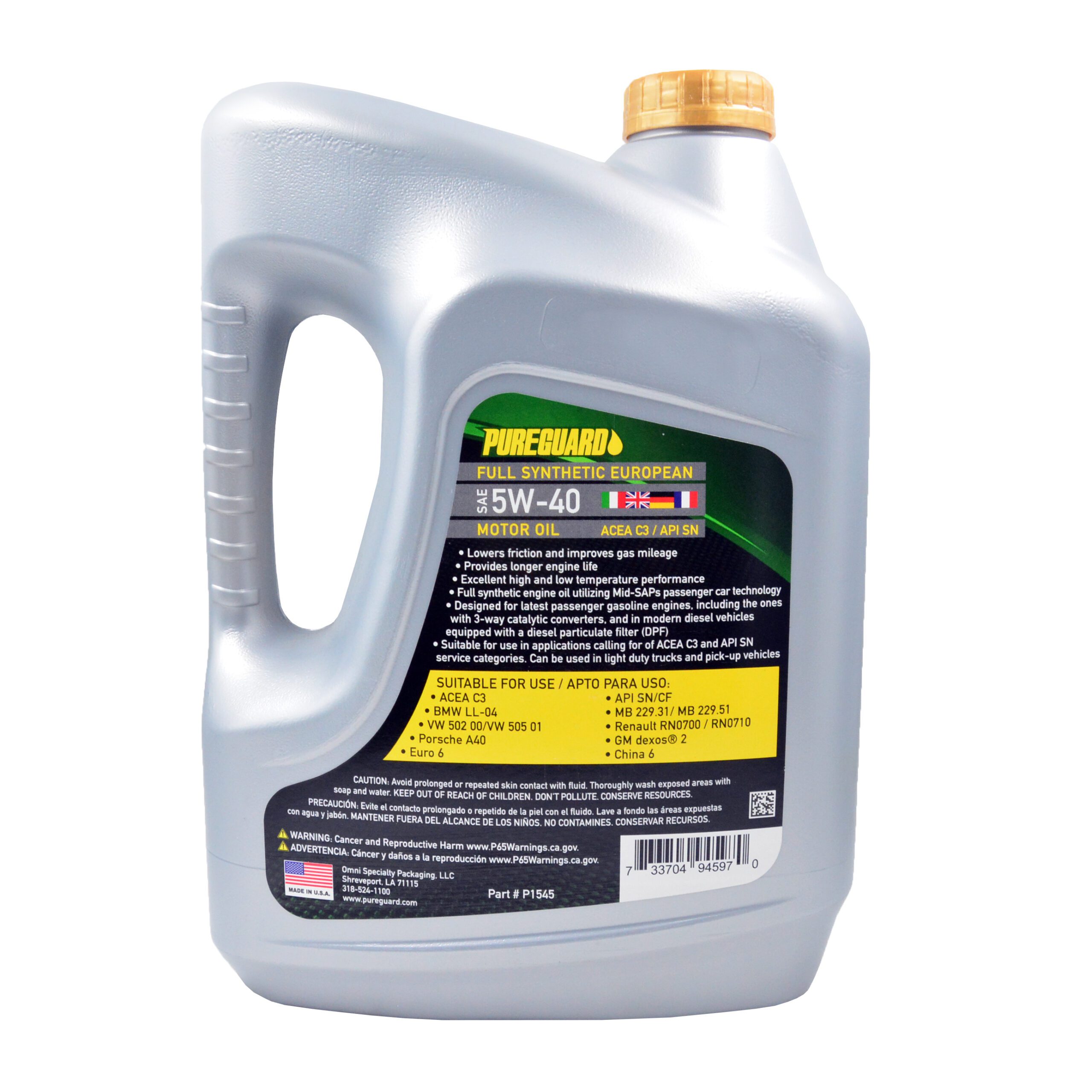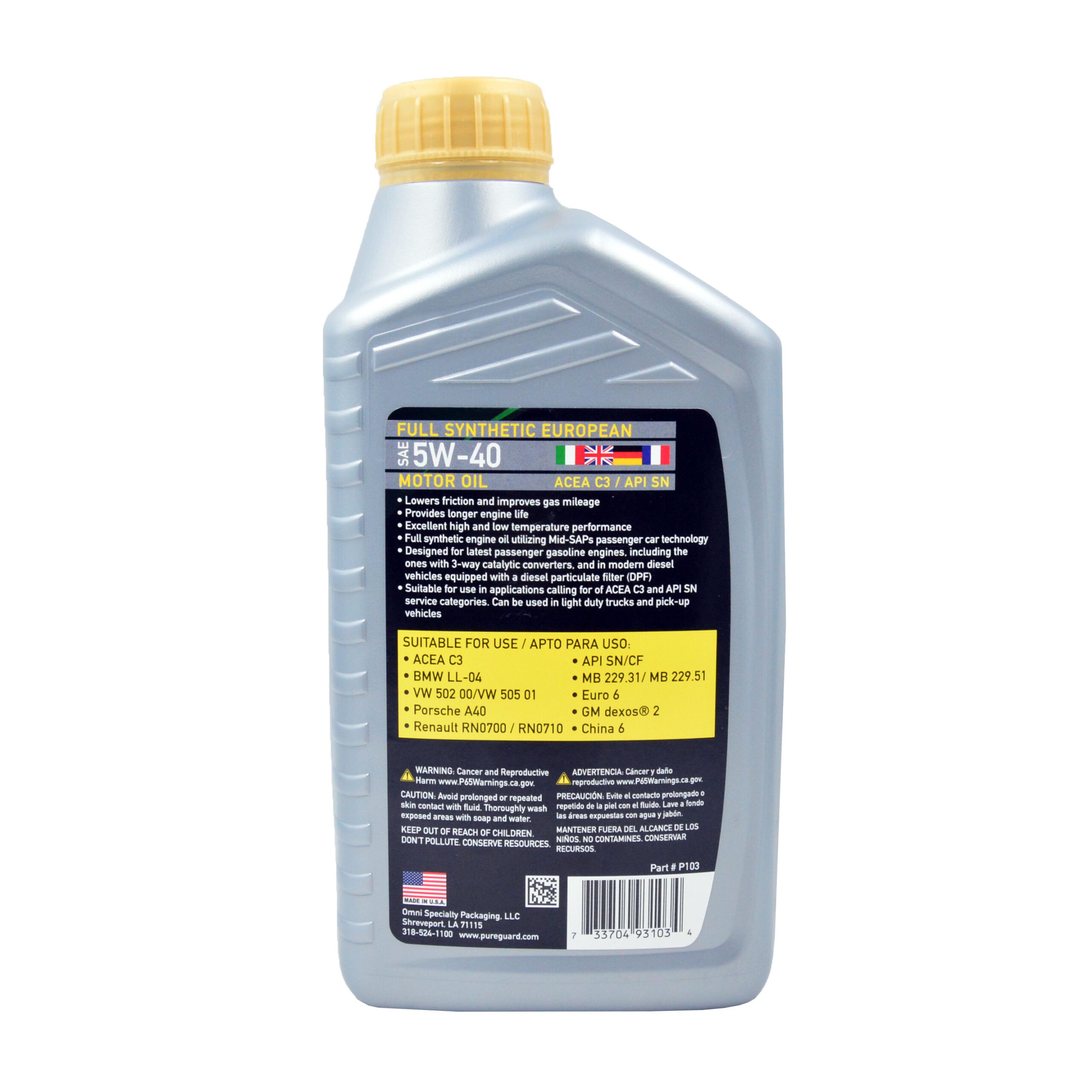PG Pure Guard Full Synthetic Euro SAE 5W-40 SN/C3 — полностью синтетическое моторное масло, изготовленное по технологии Mid-SAP для легковых автомобилей. Масло разработано для современных легковых дизельных автомобилей с сажевым фильтром (DPF) и новейших бензиновых автомобилей, в том числе с трёхкомпонентными каталитическими нейтрализаторами.